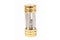 Two circular brass blocks are connected by five solid steel rods, forming a cage. Inside, a brass ball bearing rests on a small support attached to the lower block. Your goal: free the ball, without forcing or damaging the puzzle.